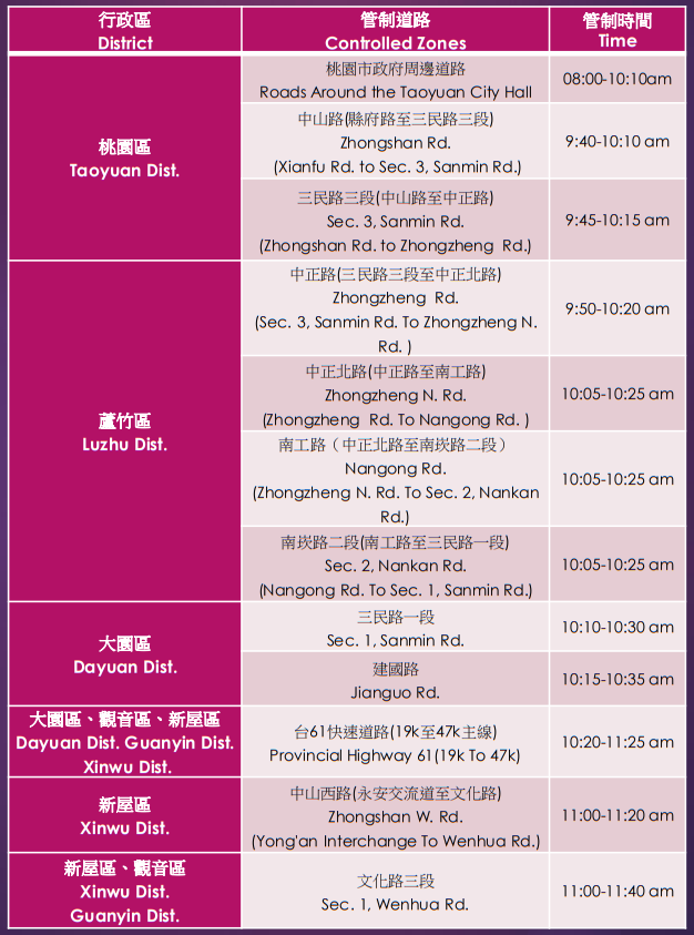 The 2nd Stage of the 2024 Tour de Taiwan will take place on March 11, Monday,2024 at Taoyuan City. The riders will start their jounery from Taoyuan City Hall, with the last stop Renai Parking Lot Jiaobanshan Park, Fuxing Dist. For your safety, you are recommended to keep alerted and patient when passing through the controlled zones. Details are shown as follows(click the image to open a window for PDF file):